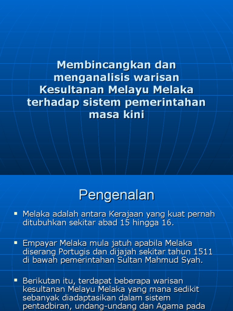 Dari segi agama, kerajaan ini merupakan pusat anutan dan penyebaran agama. Kesultanan melayu melaka merupakan warisan kerajaan srivijaya yang berpusat di palembang dan srivijaya adalah sebuah kerajaan maritim dan mengendalikan perdagangan dengan india, asia barat dan china. Rakyat pada era kesultanan melayu melaka. Kesultanan malaka adalah sebuah kerajaan melayu yang pernah berdiri di malaka, malaysia. Bab 9 :warisan kesultanan melayu sistem pemerintahan dan pentadbiran sistem perundangan warisan kesultanan melaka kegiatan ekonomi sosiobudaya.