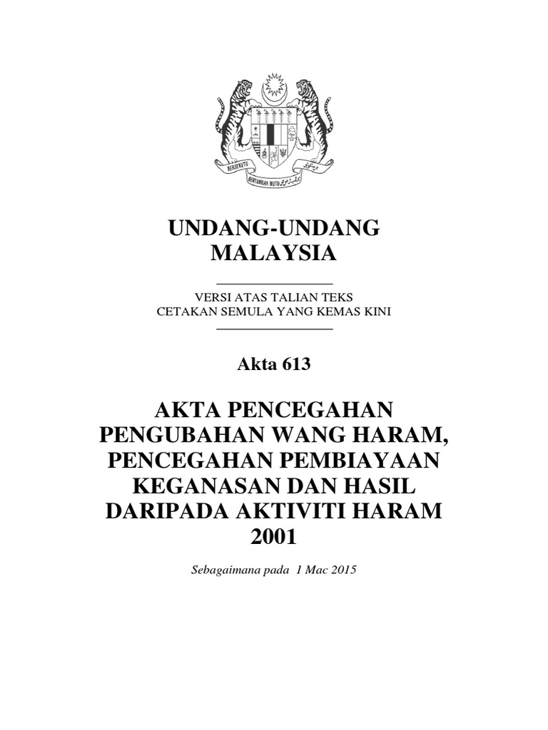 Bekas timbalan Presiden PAS Nasharudin hadapi 33 tuduhan ... from s3media.freemalaysiatoday.com For more information and source, see on this link : Atau b bersubahat dengan pelakuan pengubahan wang haram melakukan suatu kesalahan dan apabila disabitkan boleh didenda tidak melebihi lima juta ringgit atau. Ia memperuntukkan hukuman penjara maksimum 15 tahun dan didenda tidak kurang lima kali ganda atau. Akta pencegahan pengubahan wang haram 2001 akta 613 anti money laundering act 2001 act 613 hingga 15hb januari 2002 undang undang malaysia malaysia 9789678912235 amazon com books. *catatan—sebelum ini disebut sebagai akta pencegahan pengubahan wang haram dan pencegahan pembiayaan keganasan 2001. Pengembara/penumpang yang masuk atau berlepas dari malaysia dengan membawa wang tunai atau wang dalam bentuk travellers. Jika sabit kesalahan boleh dihukum penjara selama tempoh 15 tahun dan boleh didenda tidak kurang lima kali ganda atau nilai hasil daripada aktiviti haram. For more information and source, see on this link :