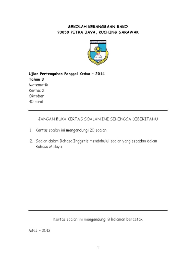 Kertas peperiksaan ini adalah matematik untuk murid darjah 3 mengikut kurikulum standard sekolah rendah (kssr). Koleksi soalan peperiksaan kurikulum standard sekolah rendah yang disediakan hanyalah sebagai panduan dan rujukan para guru di seluruh malaysia. Ujianpengesananmac2016 matematik tahun 3 1 bulatkan jawapan yang betul. So please help us by uploading 1 new document or like us to. → koleksi soalan, latihan, nota, buku teks tahun 1, 2, 3, 4, 5, 6.